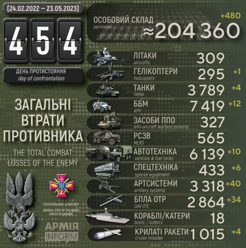 Сили оборони за добу знищили ворожий гелікоптер, 40 артсистем і майже 500 окупантів480 осіб, один гелікоптер і чотири крилаті ракети втратили окупанти в Україні за минулу добу. Крім того, за даними Генерального штабу Збройних сил України, наші захисники також знищили чотири танки, 12 бойових броньових машин, 40 артсистем, 34 БПЛА оперативно-тактичного рівня, десять одиниць автомобільної техніки і шість одиниць спецтехніки. Усього з початку повномасштабного вторгнення втрати ворога склали: особового складу — 204 360 осіб; танків ‒ 3789 одиниць; бойових броньованих машин ‒ 7419 одиниць; артилерійських систем – 3318 одиниць; РСЗВ – 565 одиниць; засоби ППО ‒ 327 одиниць; літаків – 309 одиниць; гелікоптерів – 295 одиниць; БПЛА оперативно-тактичного рівня – 2864; крилаті ракети ‒ 1015; кораблі /катери ‒ 18 одиниць; автомобільної техніки та автоцистерн – 6139 одиниць; спеціальна техніка ‒ 433. СМЕРТЬ РОСІЙСЬКИМ ОКУПАНТАМ! Помітили помилку? Виділяйте слова з помилкою та натискайте control-enter |