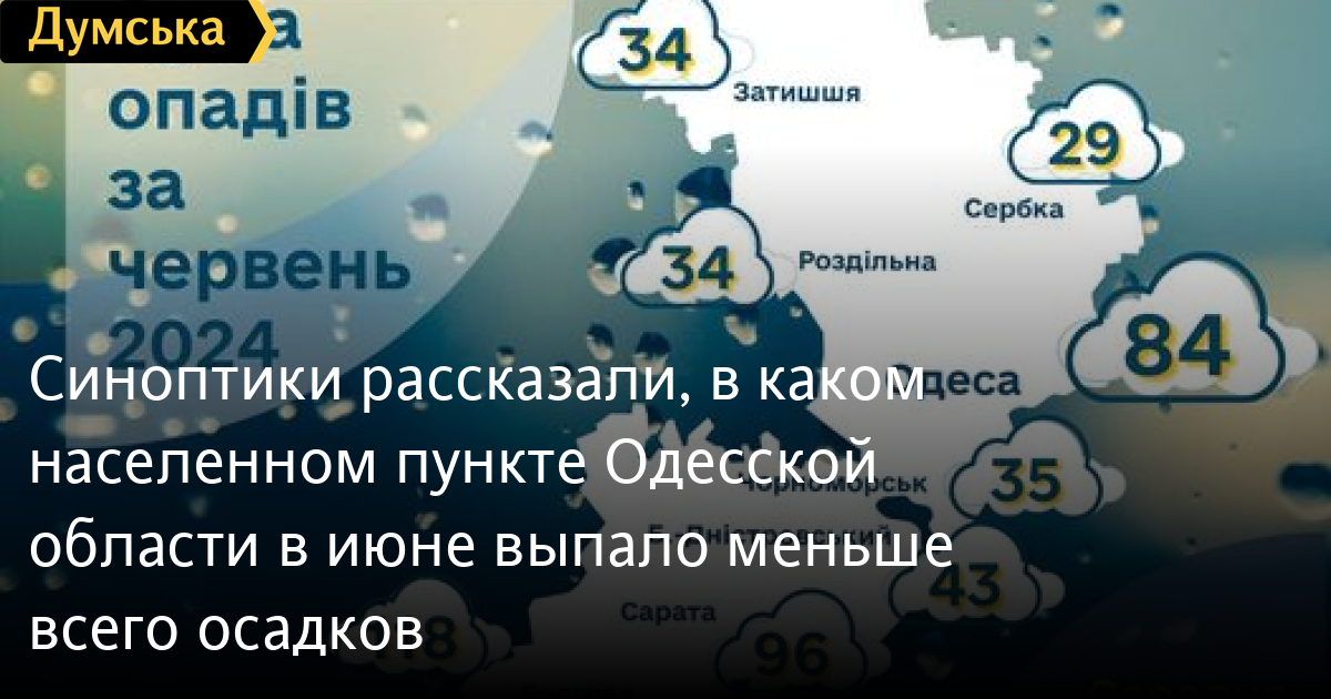 Синоптики розповіли, у якому населеному пункті Одеської області в червні випало найменше опадівНайменше опадів у червні випало в Сербці Одеського району — 29 мм, найбільше — 118 мм - у Болграді. Про це розповіли фахівці Гідрометцентру Чорного та Азовського морів. Усього сума опадів по Одеській області за червень 2024 року: Сербка — 29 мм; Затишшя — 34 мм; Роздільна — 34 мм; Чорноморськ — 35 мм; Білгород-Дністровський — 43 мм; Любашівка — 48 мм; Ізмаїл — 69 мм; Одеса — 84 мм; Вилкове — 96 мм; Сарата — 96 мм; Болград — 118 мм. Середня багаторічна норма опадів червня для Одеси — 48 мм. Помітили помилку? Виділяйте слова з помилкою та натискайте control-enter Новини по цій темі: 7 листопада 2025: До +16, але з дощами: в Одесі прогнозують погіршення погоди 29 жовтня 2025: Котельні готові: Одеса увімкне опалення за два тижні, а початок листопада буде аномально теплим 6 жовтня 2025: Через погіршення погоди школи та садочки Одеської області переводять на дистанційне навчання 1 жовтня 2025: Катастрофа, яку можна було попередити (блог) |