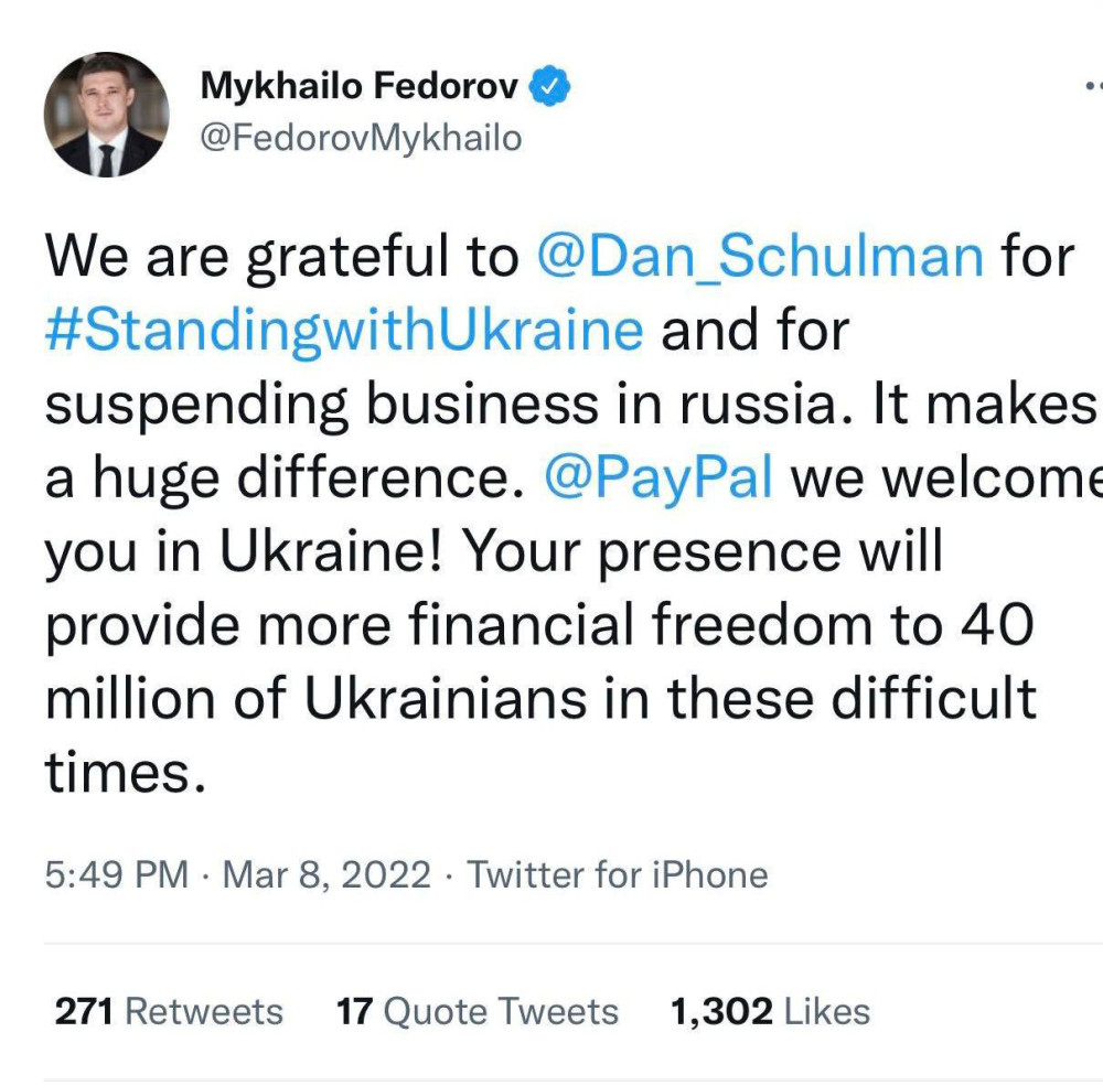 Министр цифровой трансформации Михаил Федоров заявил, что уже есть подвижки в этом вопросе — система PayPal уходит из России и заработает в Украине.