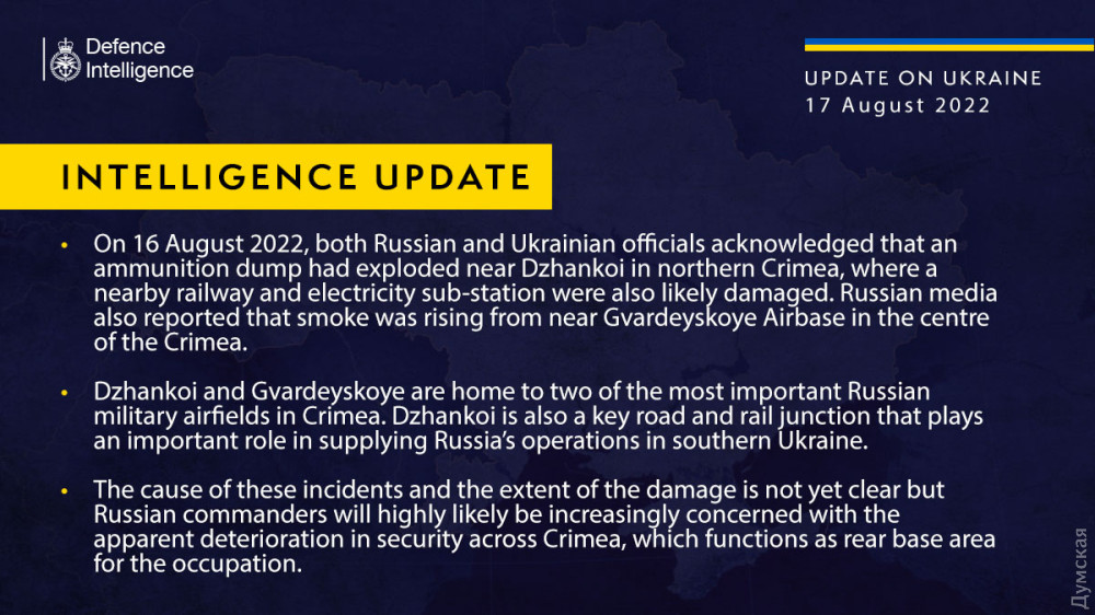 «Джанкой і Гвардійське є базами для двох найважливіших російських військових аеродромів у Криму. Джанкой також є ключовим автомобільним і залізничним вузлом, який відіграє важливу роль у забезпеченні російських операцій на півдні України. Причина цих інцидентів і масштаб збитку ще не зрозумілі, але російське командування, швидше за все, буде все більше стурбоване очевидним погіршенням безпеки в Криму, який функціонує як тиловий район для окупації», — йдеться у повідомленні британської розвідки.