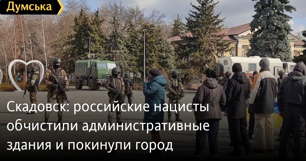 Городскому голове и секретарю горсовета угрожали убийством, если митинги в городе еще будут проходить и дальше. К спинам руководителей города приставили пулеметы и орали, что расстреляют их, если люди будут еще собираться. Ответ скадовчан: вчера состоялся самый массовый митинг в городе. Оккупанты убрались из города, оставив после себя ограбленные и разрушенные административные здания. Таков он «русский мир».