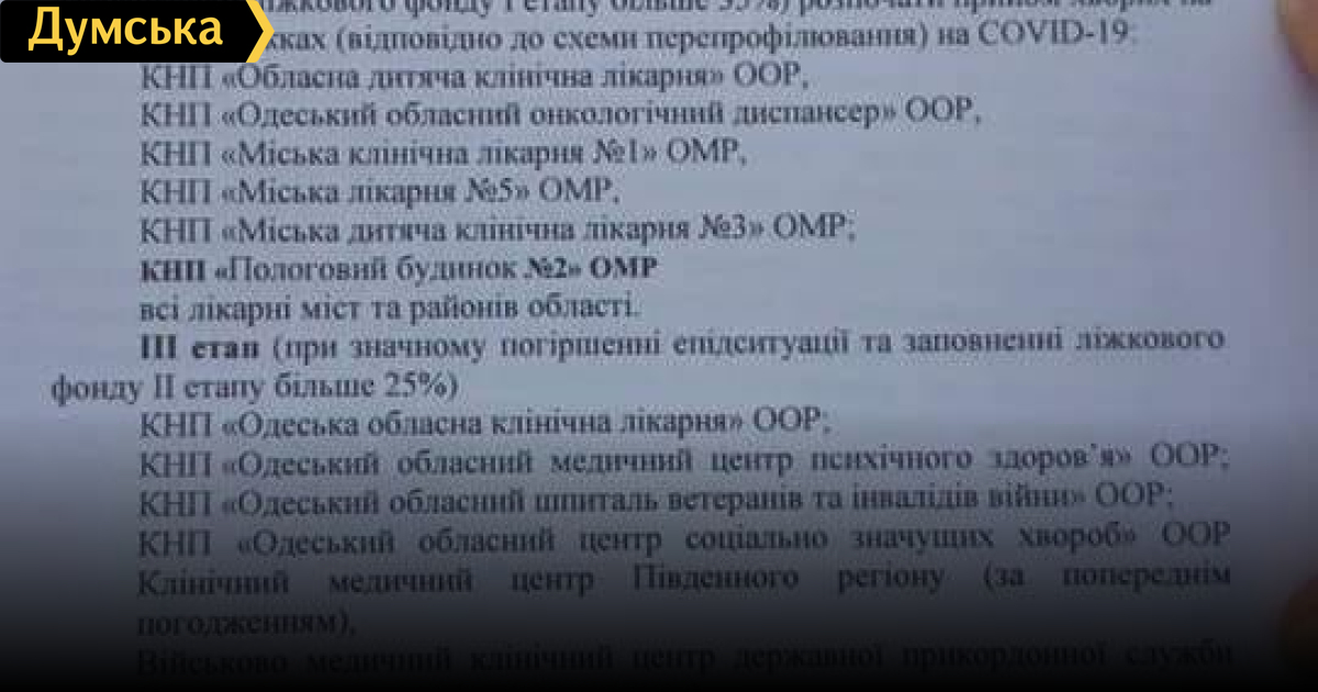Продолжаются дискуссии вокруг приказа властей со списком клиник Одесской области, которые должны принимать пациентов с COVID-19. Активисты обеспокоены тем, что при заполнении госпитальных баз первой волны на 35% больных коронавирусом начнут принимать и районные больницы области, которые к этому абсолютно не готовы. «Нужно ли неподготовленные больницы районов подключать на втором эшелоне? Моя позиция против, потому что ни врачи не защищены и опыта не имеют, ни полного спектра лекарств нет», — отметил активист из Черноморска Валентин Ткачук.