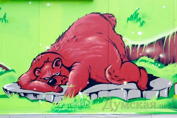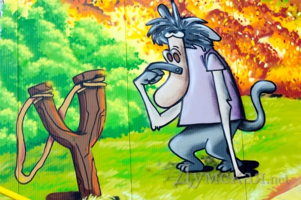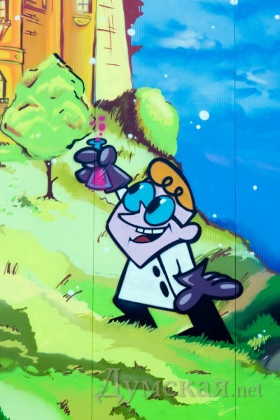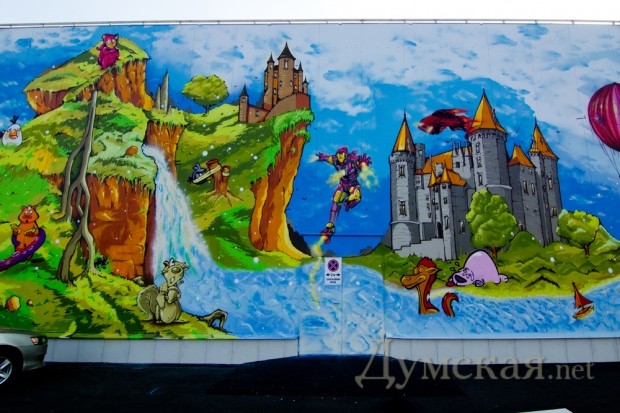 Как передает ваш корреспондент, на более чем тысячи квадратных метров ранее безликой поверхности расцвело эпическое полотно с изображением сказочной страны, населенной мультипликационными героями.
