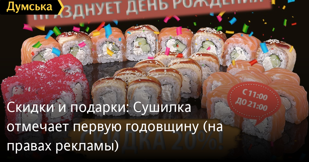 15 августа сервис доставки еды «Сушилка» празднует свою первую годовщину! Ровно год назад тогда еще служба доставки роллов и суши «Сушилка» выполнила первый заказ. Сервис не стоял на месте и регулярно пополнял, расширял и совершенствовал доступный выбор блюд. Так, вскоре после начала работы число доступных на выбор роллов увеличилось почти вдвое, а также был дан старт работе WOK-цеха. Впоследствии было решено расширить ассортимент онлайн-ресторана, добавив два десятка разнообразных пицц в самых смелых сочетаниях и композициях. Примечательно, что изначально «Сушилка» не шла по легкому пути и пыталась добиться аутентичного вкуса для этого блюда, потому было отдано предпочтение настоящей дровяной, а не электропечи. По случаю праздника сервис дарит 20% скидку 15 августа 2018 года в период с 11:00 до 21:00. Заказы будут принимать до 21:00. Заказ можно сделать на сайте sushilka.od.ua или по телефонам: 073-240-0-140 (Lifecell); 095-240-0-140 (Vodafone); 096-240-0-140 (Kyivstar); 048-735-29-99 (городской). СМЕРТЬ РОССИЙСКИМ ОККУПАНТАМ! Заметили ошибку? Выделяйте слова с ошибкой и нажимайте control-enter |