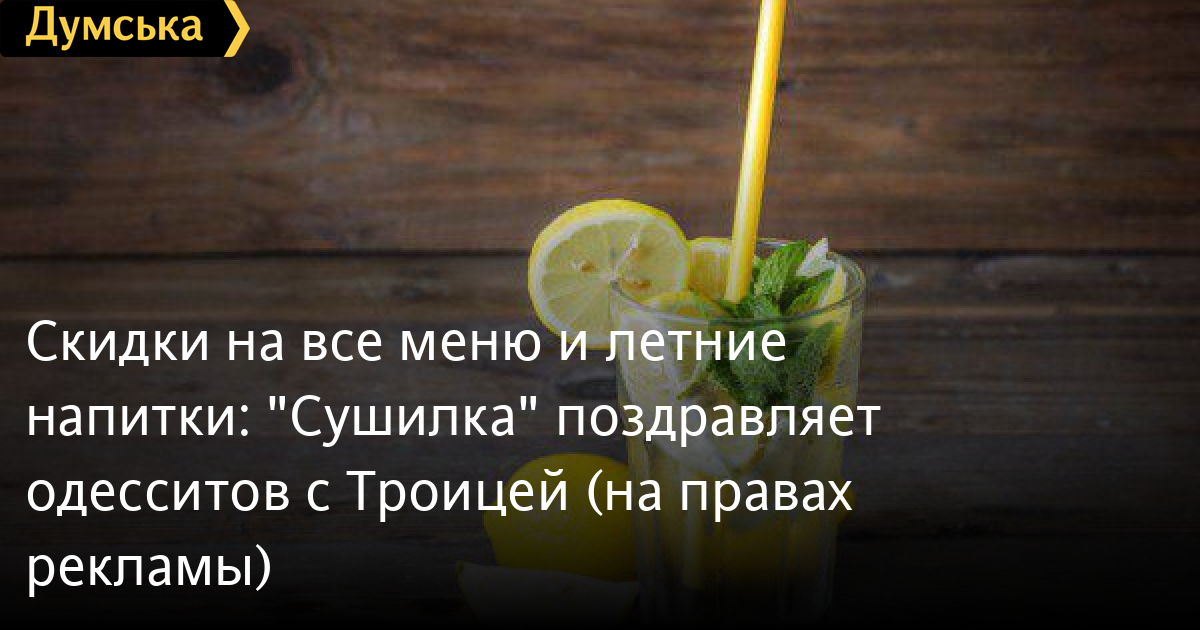 Скидки на все меню и летние напитки: «Сушилка» поздравляет одесситов с Троицей (на правах рекламы)Служба доставки еды «Сушилка» поздравляет одесситов и гостей города с праздником Троицы. По многочисленным просьбам клиентов «Сушилка» добавила в меню новые летние напитки — лимонад и морс. Также в сервисе сообщают, что с 17 по 20 июня включительно будут действовать скидки от 20% до 30% на все меню. Заказ можно сделать на сайте sushilka.od.ua или по телефонам: 073-240-0-140; 095-240-0-140; 096-240-0-140; 048-735-29-99. СМЕРТЬ РОССИЙСКИМ ОККУПАНТАМ! Заметили ошибку? Выделяйте слова с ошибкой и нажимайте control-enter |