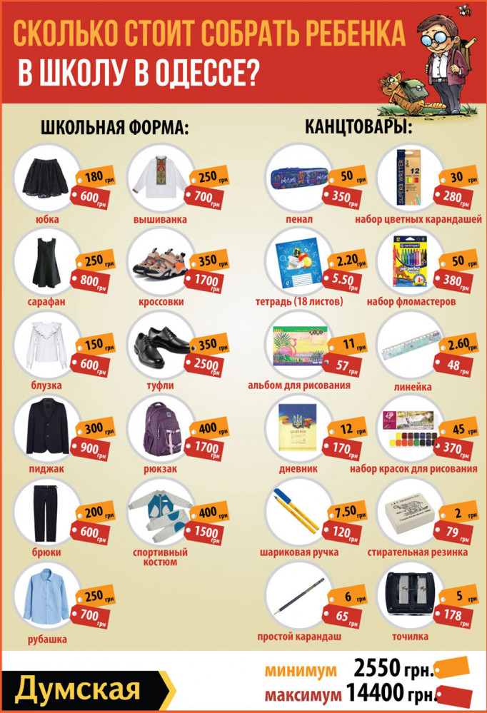 До начала учебного года осталось совсем ничего, и родители бегают по магазинам, выкладывая деньги на сборы детей к школе. В среднем, по подсчетам «Думской», им предстоит потратить минимум 2550 грн, а максимум — 14400 грн.