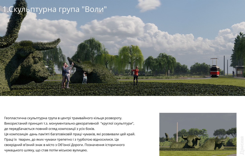 У центрі розворотного кільця автори проєкту пропонують розмістити величезні геопластичні скульптури українських волів, як данину пам'яті чумакам, один зі шляхів яких проходив у цій місцевості.