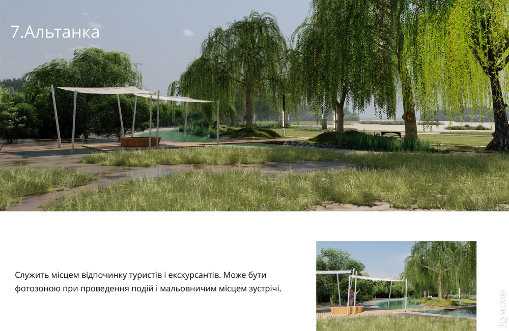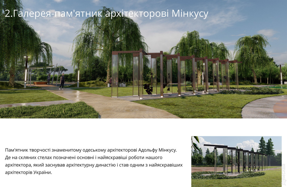 Крім того, концепція передбачає благоустрій всієї території: створення галереї-пам'ятника на честь архітектора Адольфа Мінкуса, невеликого ставка, вербного гаю, альтанок та іншої інфраструктури.