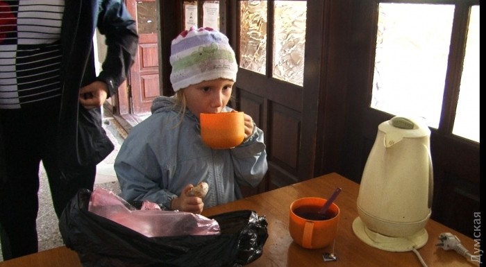 А вот так это происходит сегодня. Захожу в первый корпус того же санатория. Там отключили электричество, отключили воду, отключили лифты. Единственная действующая розетка на первом этаже, возле нее хмурая очередь людей с кипятильниками и чайниками. Напомню: там проживают исключительно инвалиды. Люди, передвигающиеся с трудом. На колясках. Торговцам ларьков, расположенных на территории «Куяльника», запретили продавать что-либо инвалидам-переселенцам. Даже бутылку воды.