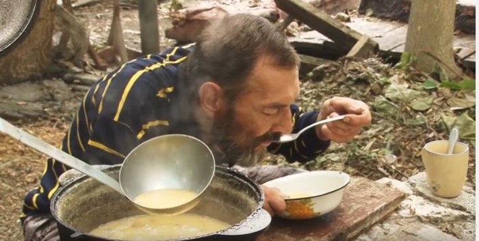 Ирина хлопочет на «кухне», сегодня она дежурная. «Кухня» — это место во дворе, на вольном воздухе, отгороженное сваленными плитами. Тут же огромные вязанки дров для растопки и мангал. На нем - почерневший от копоти чайник. И кастрюля с бульоном. Варятся мослы.