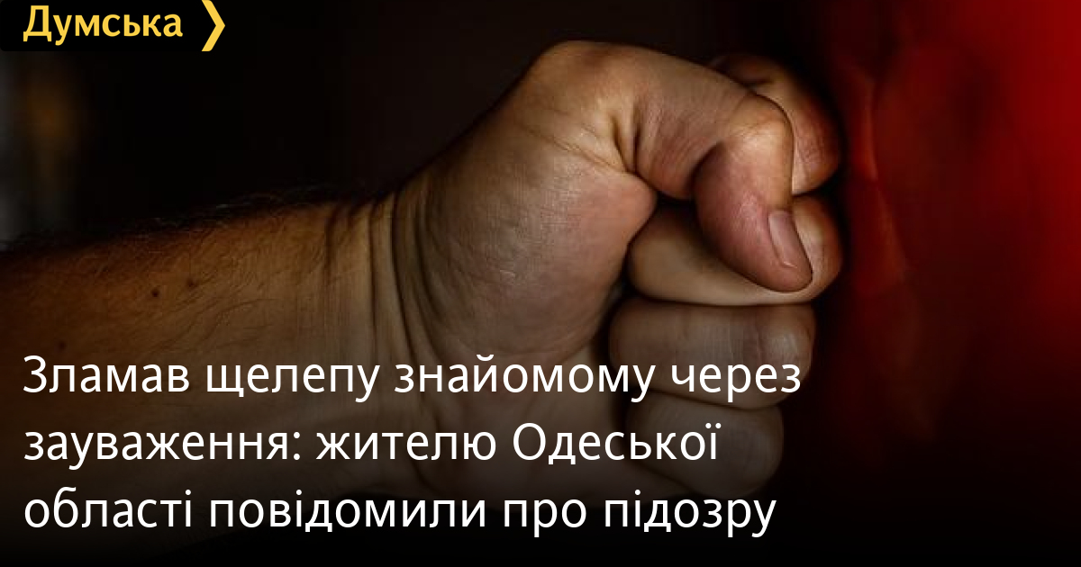 Зламав щелепу знайомому через зауваження: жителю Одеської області повідомили про підозруЖителю Роздільнянського району Одеської області повідомили про підозру в нанесенні тілесних ушкоджень середньої тяжкості своєму знайомому. Як розповіли в пресслужбі поліції регіону, 38-річний чоловік зробив зауваження 25-річному односельчанину за те, що той був п'яний. Молодшому за віком це не сподобалося, між ними спалахнула сварка, під час якої 25-річний побив знайомого. Він зламав йому щелепу. Правоохоронцям він пояснив, що хотів провчити кривдника. Фігуранту повідомили про підозру за ч. 1 ст. 122 КК України. Йому загрожують виправні роботи на строк до двох років, або обмеження чи позбавлення волі на строк до трьох років. Наразі вирішується питання про обрання підозрюваному запобіжного заходу. Помітили помилку? Виділяйте слова з помилкою та натискайте control-enter Новини по цій темі: 29 липня 2025: В Усатово Одеської області сталася перестрілка: поліція працює на місці (відео, оновлено) 28 липня 2025: П'яний на "Ягуарі" або гіпертонік? Звільнений топ-посадовець одеської поліції хоче повернутися на службу 19 червня 2025: Дівчинку, яку шукали сотні одеситів, знайшли вбитою: поліція працює з чоловіком, ймовірно причетним до загибелі 27 травня 2025: Увели гектар в університету: на Одещині засудили земельних аферистів, але без посадки і Хвоста |