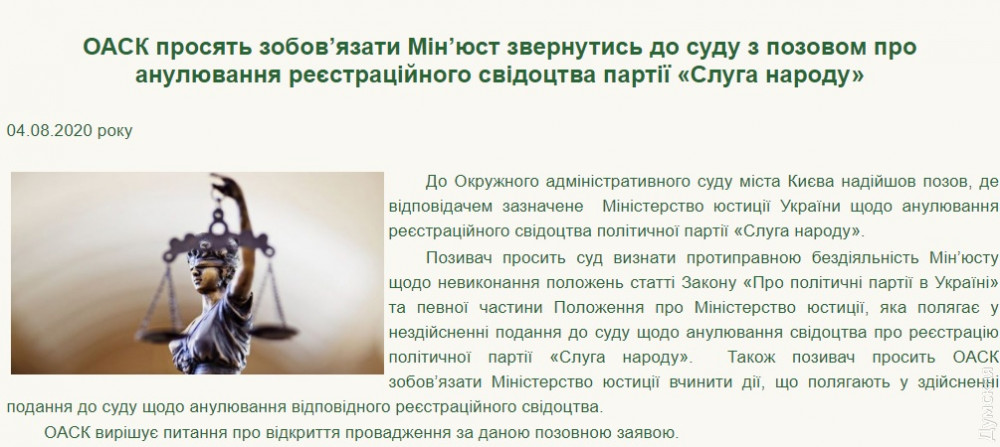 Также заявитель просит ОАСК обязать Минюст обратиться в суд с иском об аннулировании регистрационного свидетельства партии «Слуга народа».