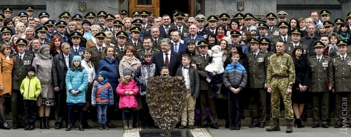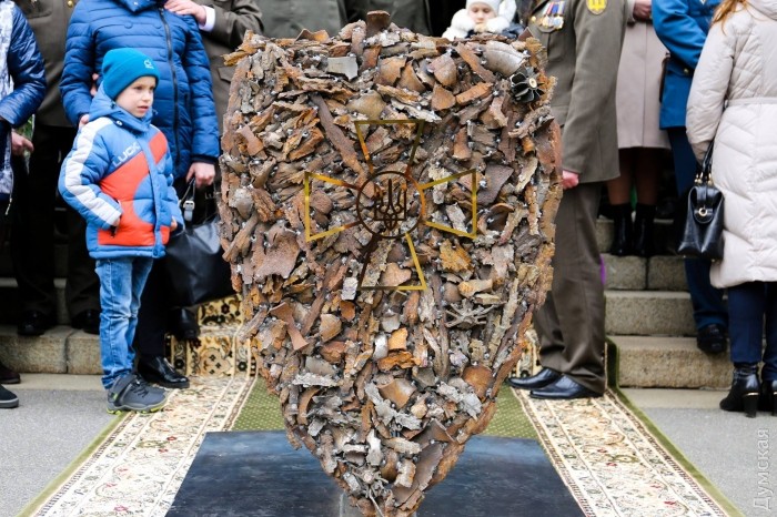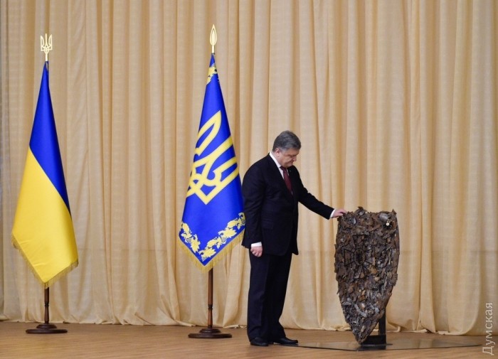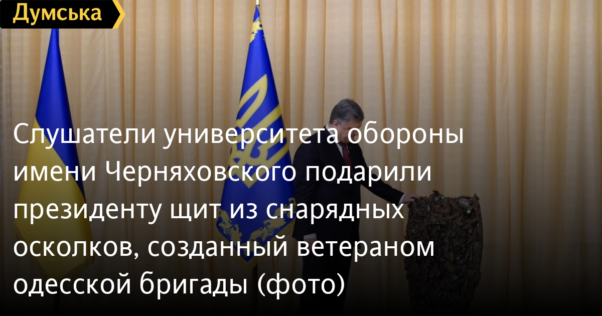 Слушатели и выпускники Национального университета обороны Украины имени Черняховского (все — боевые офицеры) подарили президенту Украины, Верховному главнокомандующему Вооруженных сил Украины Петру Порошенко символический щит, изготовленный из осколков снарядов, собранных в зоне боевых действий на востоке страны.