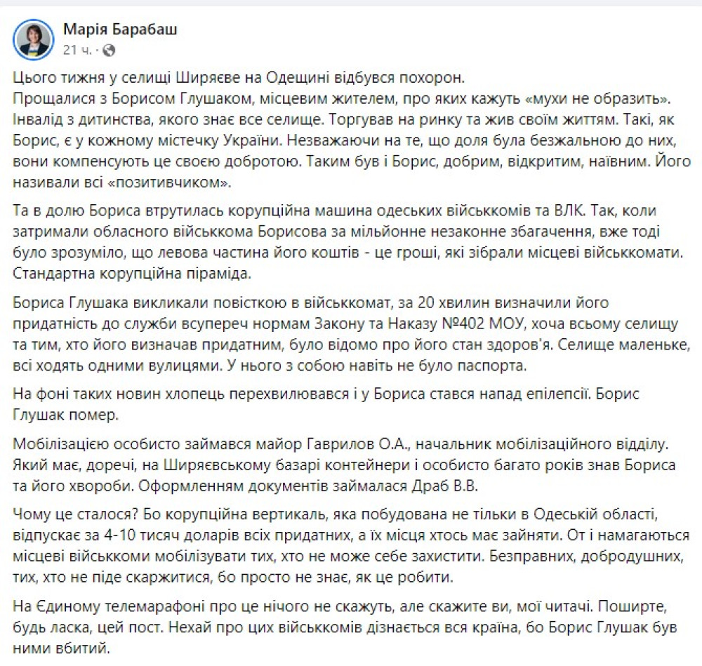 Смерть мобілізованого на Одещині: військові заявили, що людину з епілепсією призвали з вини лікарів29-річного жителя Ширяєвого Бориса Глушака поховали днями в рідному селищі. До смерті чоловіка, який страждав на важкі захворювання і помер у першу ж ніч після мобілізації, призвела корупція серед працівників військкомату та представників лікарської комісії, впевнені близькі Бориса. Трагічну історію розповіли жителі Ширяєвого в місцевому пабліку. Люди в подробицях розписали, як Борис, інвалід дитинства, який працює на місцевому ринку, після отримання повістки з'явився у військкомат, навіть не маючи при собі паспорта. Там він за лічені хвилини пройшов комісію і був визнаний здоровим і придатним до військової служби. Через кілька годин він перебував уже у військовій частині. «За 20 хвилин визначили його придатність до служби, всупереч нормам Закону та наказу №402 МОУ, хоча всьому селищу і тим, хто його визначав придатним, було відомо про його стан здоров'я. Селище маленьке, всі ходять одними вулицями — написала користувачка пабліка Марія Барабаш. — Мобілізацією особисто опікувався майор Гаврилов А.А., начальник мобілізаційного відділу, який має, до речі, на Ширяївському базарі контейнери і особисто багато років знав Бориса і його хвороби. Оформленням документів займалася Драб В.В. Чому це сталося? Тому що корупційна вертикаль, яка побудована не тільки в Одеській області, відпускає за 4-10 тисяч доларів усіх придатних, а їхні місця хтось має зайняти». На тлі стресу в першу ж ніч у Бориса стався напад епілепсії, під час якого він помер. Медики частини не змогли йому допомогти. Як повідомив громадський активіст Павло Паламарчук, Борис — з дуже бідної сім'ї. Його родичі так і не написали заяву в правоохоронні органи за фактом його загибелі, а сусіди та близькі бояться відкрито виступити проти посадовців, дії яких призвели до трагедії. «За словами місцевих жителів, дав згоду на призов Борьки в прискореному режимі новий воєнком селища Ширяєве, колишній керівник 14-ї колонії міста Одеси — капітан Стахов Олександр Анатолійович», — зазначив Поламарчук. В оперативному командуванні «Південь» журналістам розповіли, що питання про те, яким чином людину з інвалідністю визнали здоровою і вона опинилася в лавах Збройних Сил, «потрібно ставити лікарям». «Рішення було медичної комісії. ТЦК прийняв документи від медиків, що здоровий і придатний. А комісію пройшов у лікарні, тому й коментувати мають вони», — заявила в коментарі виданню «Інтент» начальниця об'єднаного координаційного пресцентру Сил оборони півдня України Наталія Гуменюк. СМЕРТЬ РОСІЙСЬКИМ ОКУПАНТАМ! Помітили помилку? Виділяйте слова з помилкою та натискайте control-enter Новини по цій темі: |
