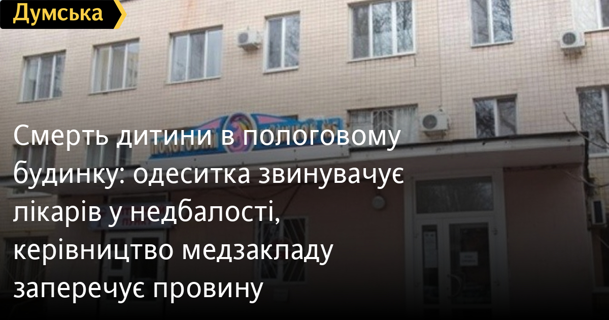 Смерть дитини в пологовому будинку: одеситка звинувачує лікарів у недбалості, керівництво медзакладу заперечує провинуСкандал через смерть новонародженого в пологовому будинку №5 розгорівся в Одесі. Мати дитини звинувачує лікарів, ті запевняють, що діяли за протоколом. Одеситка Олена Бойко розповіла в соцмережах, що ще 17 червня під час огляду їй було настільки боляче, що вона плакала і просила лікарку Катерину Шаповал зробити їй кесарів розтин, бо сама вона народити не зможе. Але отримала відмову. Дівчина повернулася додому, а на ранок у неї почалася кровотеча. Вона зателефонувала лікарю, яка відповіла, що «це так відходять води», але сказала приїхати в пологовий будинок. Там гінекологиня знову заявила, що все в межах норми і відправила одеситку в пологовий зал. «Мене підключили до апарату КТГ і серцебиття у дитини було 180-190 ударів. Мені було дуже боляче, я не могла дихати і просила зробити мені кесарів розтин, на що отримала відповідь: «Не кричи, усім боляче, це пологи, народиш сама», — розповідає Олена. За словами дівчини, потім її оглянули ще троє лікарів, які також сказали, що все нормально і відмовили їй у кесаревому розтині. Після кількох уколів знеболювального, які діяли не більше ніж півгодини, серцебиття дитини стало падати. «Коли вони покликали заввідділенням, на екрані вже було 70, вона оглянула мене і сказала: «Ви що, вона сама не народить, швидко веземо її на кесарів розтин Коли мене привезли в операційну, там нічого не було готово Мені вкололи анестезію і почали різати. Коли дитину дістали, то дихання в неї вже не було!», — каже Олена Бойко. Вона заявила, що лікар озвучила їй суми за пологи: 850 доларів і 1200 за кесарів, але забула взяти на себе відповідальність за свою роботу. Зі свого боку директор пологового будинку №5 Ігор Шпак повідомив, що сім'я звернулася до правоохоронних органів і зараз триває слідство, яке зробить свої висновки. При цьому, за його словами, наприкінці першого періоду пологів виникло ускладнення, яке акушери класифікують, як інтранатальний дистрес плода. «Говорячи простими словами — внутрішньоутробний плід почав страждати від гострої нестачі кисню. Згідно з клінічними протоколами, було проведено ургентну операцію кесаревого розтину. Від моменту початку страждання внутрішньоутробного плода до вилучення плода з утроби матері минуло 15 хвилин. За результатами патолого-анатомічного дослідження, дитина внутрішньоутробно загинула від гострої асфіксії, тобто нестачі кисню, пов'язаної з кровотечею з розірваної судини пуповини. Причиною розриву стало аномальне прикріплення та аномально коротка пуповина. Її довжина становила 20 см і, на жаль, такий збіг двох стільки небезпечних ускладнень призвів до смерті дитини», — наголосив Шпак. Він запевняє, що лікарі зробили все можливе, щоб максимально швидко вилучити дитину з матки, але час між початком розриву судини до смерті дитини становив максимум три хвилини, а за цей час зробити кесарів розтин нереально. Керівник пологового будинку заявив, що ніде у світі на УЗД не діагностують коротку пуповину й аномальне прикріплення. Відмову провести кесарів за бажанням жінки він пояснив відсутністю клінічних показників для цієї операції. А ось звинувачення у вимаганні грошей взагалі залишив без коментарів. У поліції Одеської області підтвердили, що розслідують об