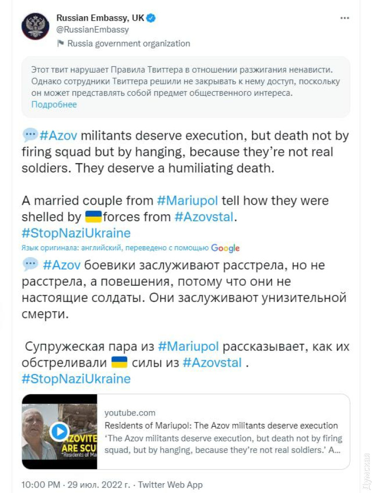 Сьогодні в твітері посольства рф в Великобританії з'явилося повідомлення, що «захисників Азовсталі треба навіть не розстрілювати, а вішати — тому що вони не справжні солдати. Тому заслуговують принизливої смерті».