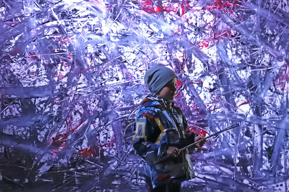 Через 10 минут световое шоу прекратилось, на узеньком мостике на двадцатиметровой высоте появилась хрупкая женская фигура со скрипичным смычком. Танец в круге света рассказал о муках творчества, после чего автор картин спустилась на набережную и прошла к зрителям.