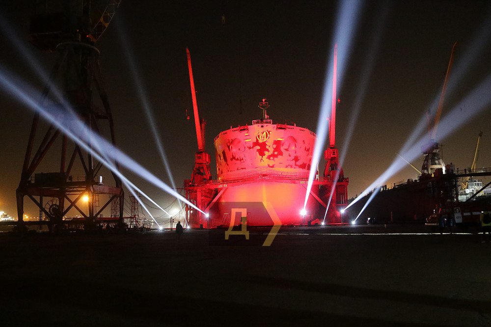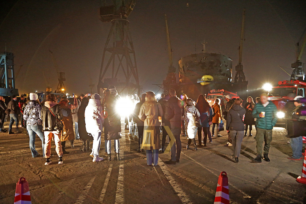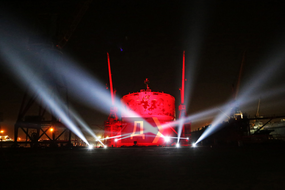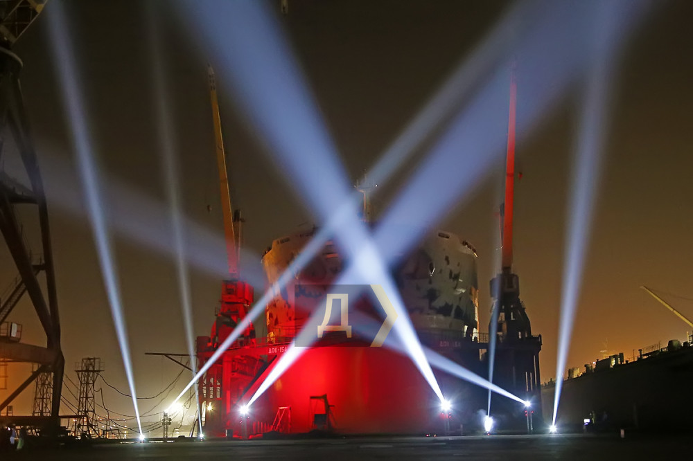 После минуты полной темноты и звенящей тишины на носовой части огромного 230-метрового сухогруза, стоящего в доке №154, появилась игра света – десяток прожекторов рисовали причудливые формы, из динамиков хлынул тяжелый металл, а языки пламени, изрыгаемые огневыми пушками, подчеркивали нереальность происходящего.