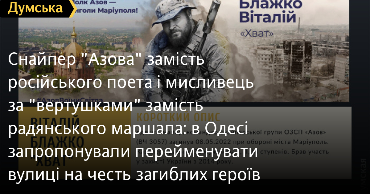 Вулицю Жуковського ініціатори пропонують перейменувати на честь одесита Віталія Блажка — майора, командира снайперської групи загону спецпризначення «Азов», повного кавалера ордена «За мужність», який загинув 8 травня 2022 року під час оборони Маріуполя.