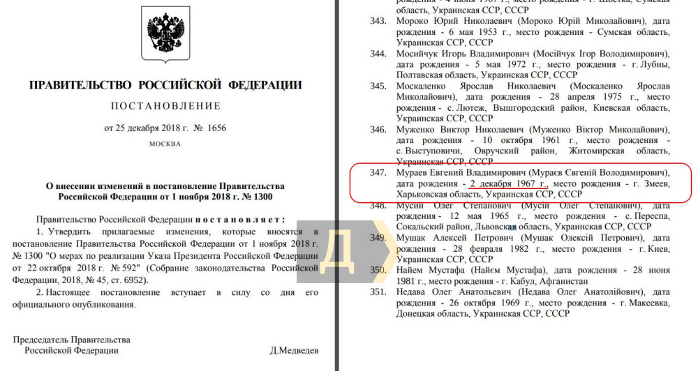 Что интересно, Евгений Мураев присутствует еще в одном санкционном списке. В 2018 году правительство страны-агрессора внесло его в список неугодных украинских политиков. Он фигурирует в нем под номером 347, рядом с Игорем Мосийчуком, Виктором Муженко и Мустафой Найемом.
