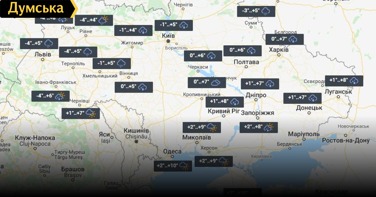 Резкое снижение температуры ожидается на следующей неделе в Украине. Как сообщает УНИАН, изменения температуры стоит ждать во вторник, 9 ноября. В этот день практически по всей стране будет +4° +8°. На Юге столбики термометров покажут +9° +10°. При этом в западных и северных областях ночью ожидаются морозы до -4°. Также повсеместно, кроме южных областей, ожидаются осадки — снег с дождем в северных регионах и местами в западных. В среду, 10 ноября, ожидается, что ночные морозы уже будут практически повсеместно и достигнут -5°. СМЕРТЬ РОСІЙСЬКИМ ОКУПАНТАМ! Помітили помилку? Виділяйте слова з помилкою та натискайте control-enter Новини по цій темі: 17 листопада 2025: Штормове попередження і мокрий сніг: в Одеській області обіцяють погіршення погоди 13 листопада 2025: Тепло не відступає: Одесі в найближчі дні обіцяють сонце і до +15 градусів 7 листопада 2025: До +16, але з дощами: в Одесі прогнозують погіршення погоди |