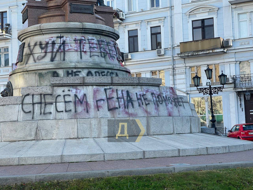 Як повідомляють у поліції, два написи «Х..й тобі а не Одесу» й «знесемо Гена не допоможе» (орфографія і пунктуація автора або авторів збережена) з'явилися на постаменті монумента.