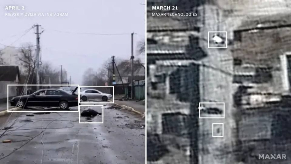 Соответствующие спутниковые снимки в качестве доказательства военных преступлений рф предоставила изданию New York Times компания Maxar Technologies.