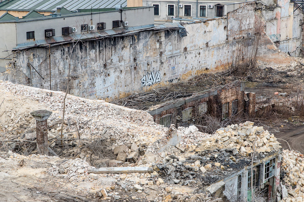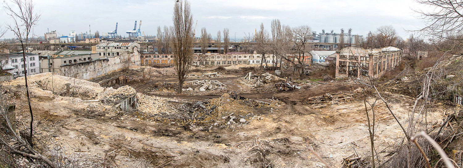 Полуразрушенные цеха судоремонтного завода (бывшие мастерские завода Беллино-Фендерих) заканчивают сносить в Одессе между спуском Маринеско, Приморской улицей и бульваром Жванецкого.