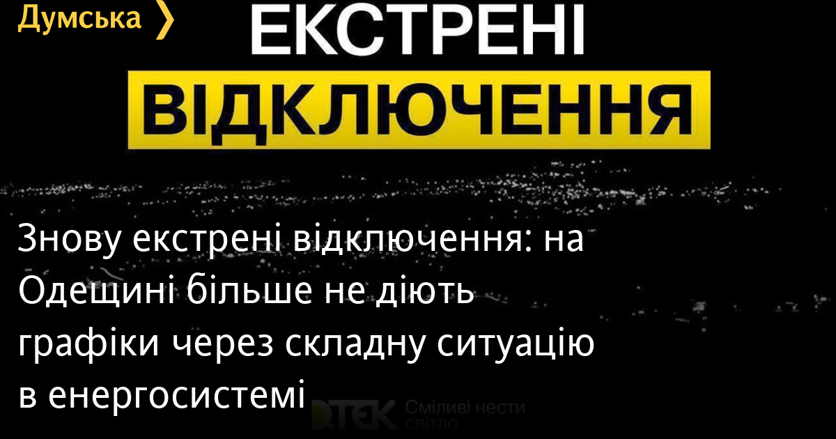 Знову екстрені відключення: на Одещині більше не діють графіки через складну ситуацію в енергосистеміЕкстрені відключення світла запровадили в Одеській, Донецькій та Київській областях, а також у столиці. Як повідомили в ДТЕК, таке розпорядження дає «Укренерго» через складну ситуацію в енергосистемі. Таким чином зараз графіки відключень не діють. «Енергетики всієї країни працюють 24/7, щоб повернути світло в оселі українців», — ідеться в повідомленні ДТЕК. СМЕРТЬ РОСІЙСЬКИМ ОКУПАНТАМ! Помітили помилку? Виділяйте слова з помилкою та натискайте control-enter |