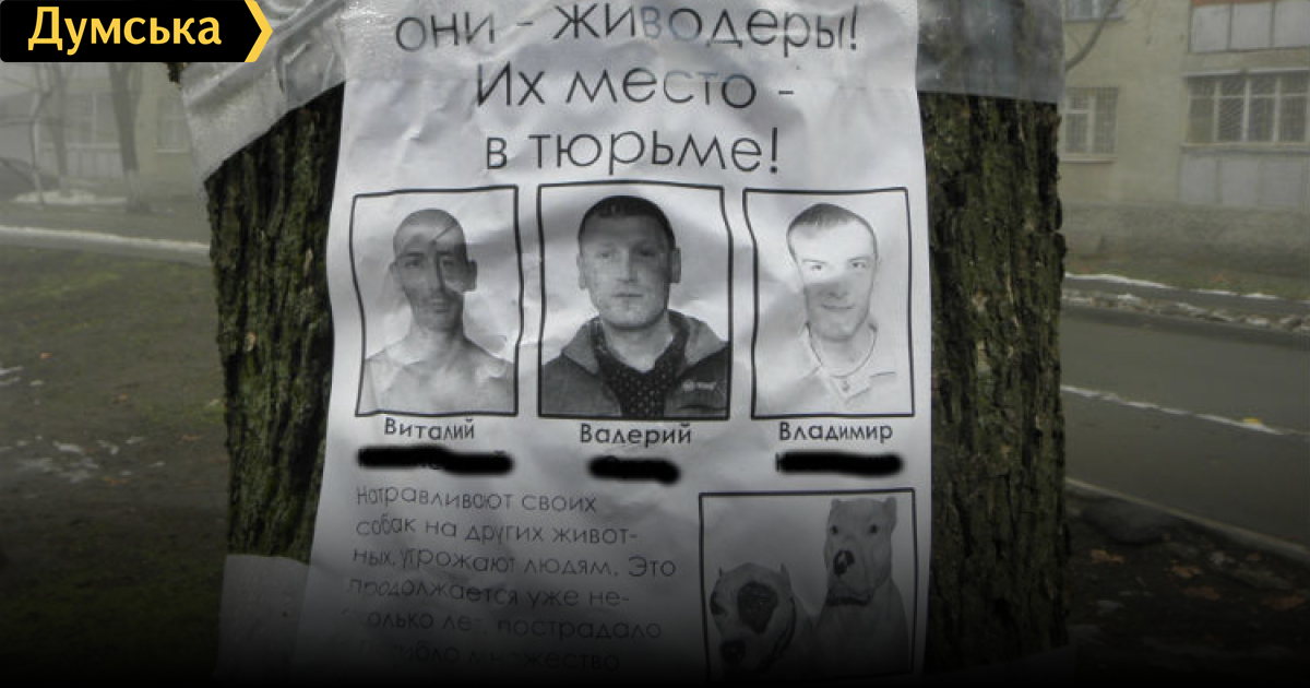 Как никто не обвиняет! ? Подождите, если написали обращение в прокуратуру (а милиция по данному факту начала расследование) то это уже априори как бы обвинение в совершении чего либо :) И да, а фразы с плаката — это что, чья то «шутка» тогда выходит? «Они преступники, они живодёры! Их место — в тюрьме!» — да да, их никто не обвиняет, ну естественно. Ну, разорвали дворняжку, не факт, что натравили хозяева, собаки часто друг на друга нападают. В любом случаи, если они сделали это умышленно, то необходимо, чтобы в судебном порядке им или дали штраф, или отобрали животных. А развешивание плакатов это ерунда.