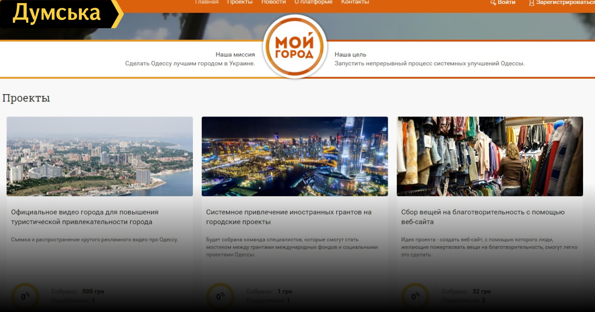 На прошлой неделе состоялся запуск обновленной версии сайта платформы «Мой Город», созданной для системных улучшений Одессы. Как сообщают разработчики, до этого платформа работала на пилотной версии с ограниченным функционалом. Цель социального проекта — привлечь заинтересованных в развитии Одессы людей и запустить процесс непрерывных улучшений города. «На данный момент техническая и финансовая части сайта работают полноценно, внешний вид платформы продолжает совершенствоваться. В новой версии сайта все посетители могут посмотреть данные по проекту и оказать ему финансовую помощь. Регистрация для этого не требуется. На странице каждого проекта указывается подробное описание путей решения проблемы с четкими сроками реализации и расписанным бюджетом», — отмечают они. Чтобы подать идею на рассмотрение, нужно: ● зарегистрироваться на сайте и указать свой номер телефона; ● подробно описать, какую проблему и как решит проект; ● указать, сколько на это потребуется денег и на что они будут расходоваться; ● сообщить, из кого будет состоять команда; ● предоставить дополнительную информацию для создания полной картины предложенной идеи. Для общения с командой платформы заработала форма обратной связи. Вскоре организаторы подключат возможность комментировать новости и проекты. Также появилась возможность подписаться на обновления проекта и оказать финансовую поддержку платформе в целом. «Сейчас на платформе зарегистрировано пять инициатив: привлечение иностранных инвестиций на развитие города; съемка промо-ролика о городе; создание сайта для сбора одежды на благотворительность; решение проблемы бездомных животных; установка пианино на улицах города. Отбор прошли еще три идеи, сейчас они готовятся к публикации», — отмечают авторы проекта. По их словам, пока на сайте зарегистрировалось только 1012 одесситов, что составляет 4,59% от цели платформы — привлечь 22 000 неравнодушных жителей Одессы.