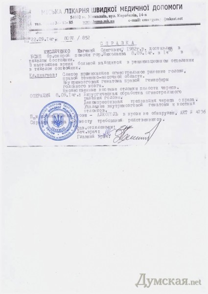 Несчастный случай произошел 8 сентября на полигоне «Широкий лан». В голову солдата попал заряд из сигнального пистолета. Евгений сейчас лежит в нейрохирургии больницы скорой помощи Николаева в состоянии комы. Волонтеры собирают деньги на его лечение.