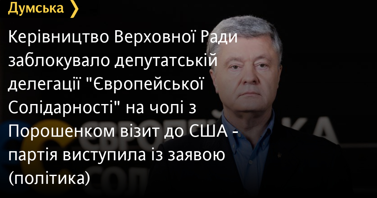 Керівництво Верховної Ради заблокувало депутатській делегації «Європейської Солідарності» на чолі з Порошенком візит до США - партія виступила із заявою (політика)Керівництво Верховної Ради зірвало робочу поїздку до США групи депутатів «Європейської Солідарності» на чолі з Петром Порошенком. Виїзд делегації на передвиборчий Республіканський національний конвент у Мілуокі, який розпочнеться 15 липня, заблокували, незважаючи на те, що про майбутній захід попередили ще кілька місяців тому, ідеться в заяві «ЄС». «Програма делегації «ЄС» у Мілуокі була насиченою, включно з участю в зустрічі делегації Міжнародного демократичного союзу з кандидатами на посади Президента (Трампом) і віцепрезидента США У Порошенка як п'ятого Президента України — успішний досвід роботи з Президентом Дональдом Трампом. Перші «Джавеліни», перші морські катери, початок перемовин щодо систем «Петріот» та гелікоптерів «Апачі», «Декларація Помпео» про американську політику невизнання спроби анексії Криму — це далеко не повний перелік, — ідеться в повідомленні. — Замість того, щоб скористатися можливістю створення потенціалу для майбутньої підтримки нашої боротьби проти агресора, українська влада знову обирає шлях токсичності та конфлікту у відносинах із командою Трампа, як це вона зробила 2020 року». Представники «ЄС» назвали таке рішення влади помилкою та порушенням стандартів міжпарламентської дипломатії. «Настав час визнати всю глибину і серйозність проблем із демократією в Україні. Поки армія воює з Росією зовні, є люди, які намагаються побудувати всередині України політичну систему за російським зразком. А в чомусь її навіть випереджають. путін тільки цього тижня підписав закон про заборону депутатам їхати за кордон без дозволу. У нас така норма діє вже кілька років», — зазначають автори заяви. СМЕРТЬ РОСІЙСЬКИМ ОКУПАНТАМ! Помітили помилку? Виділяйте слова з помилкою та натискайте control-enter