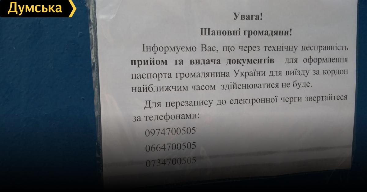 На днях в учреждении вывесили объявление о том, что «в связи с техническими неисправностями прием и выдача документов для оформления паспорта гражданина Украины для выезда за границу в ближайшее время осуществляться не будет».
