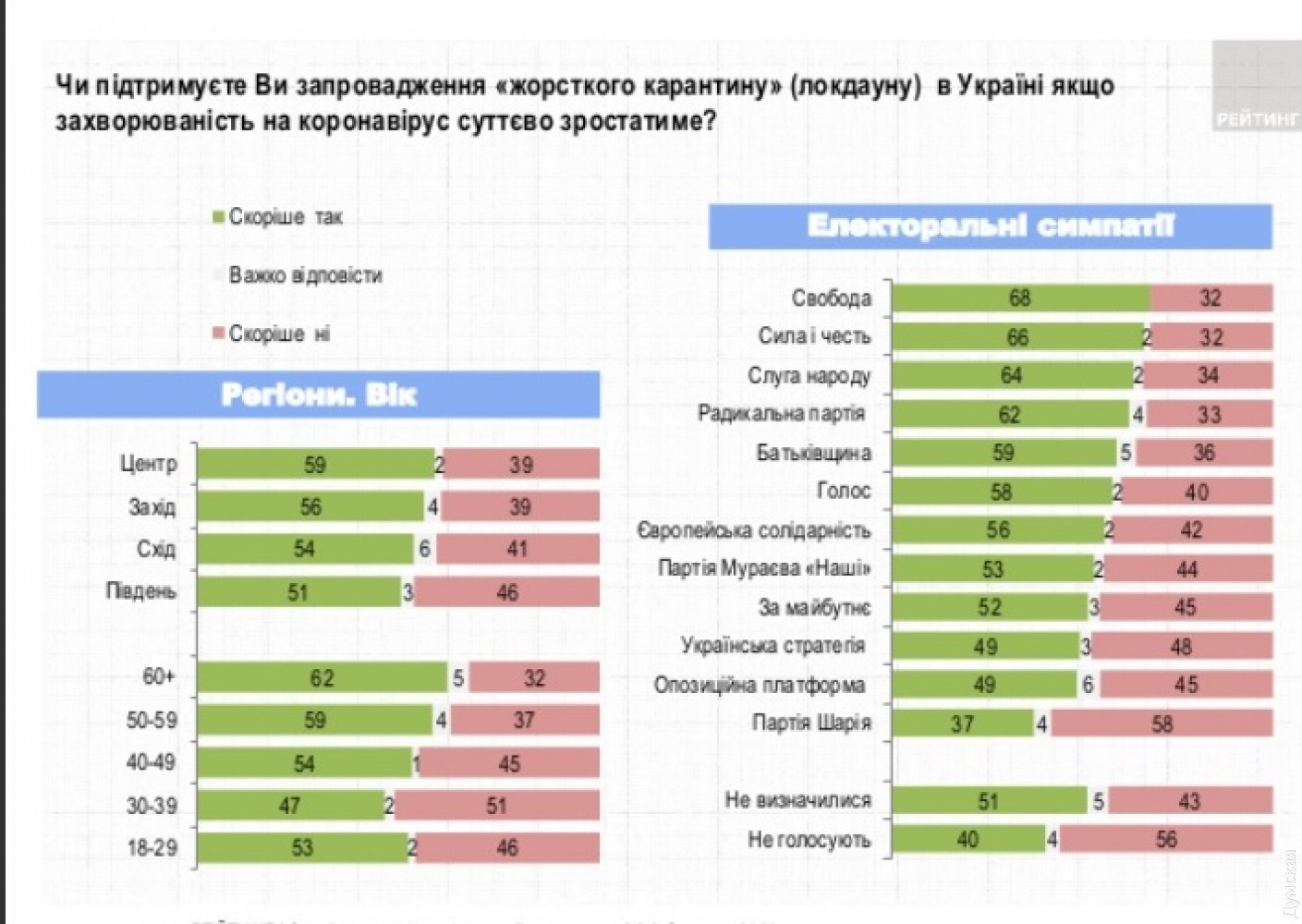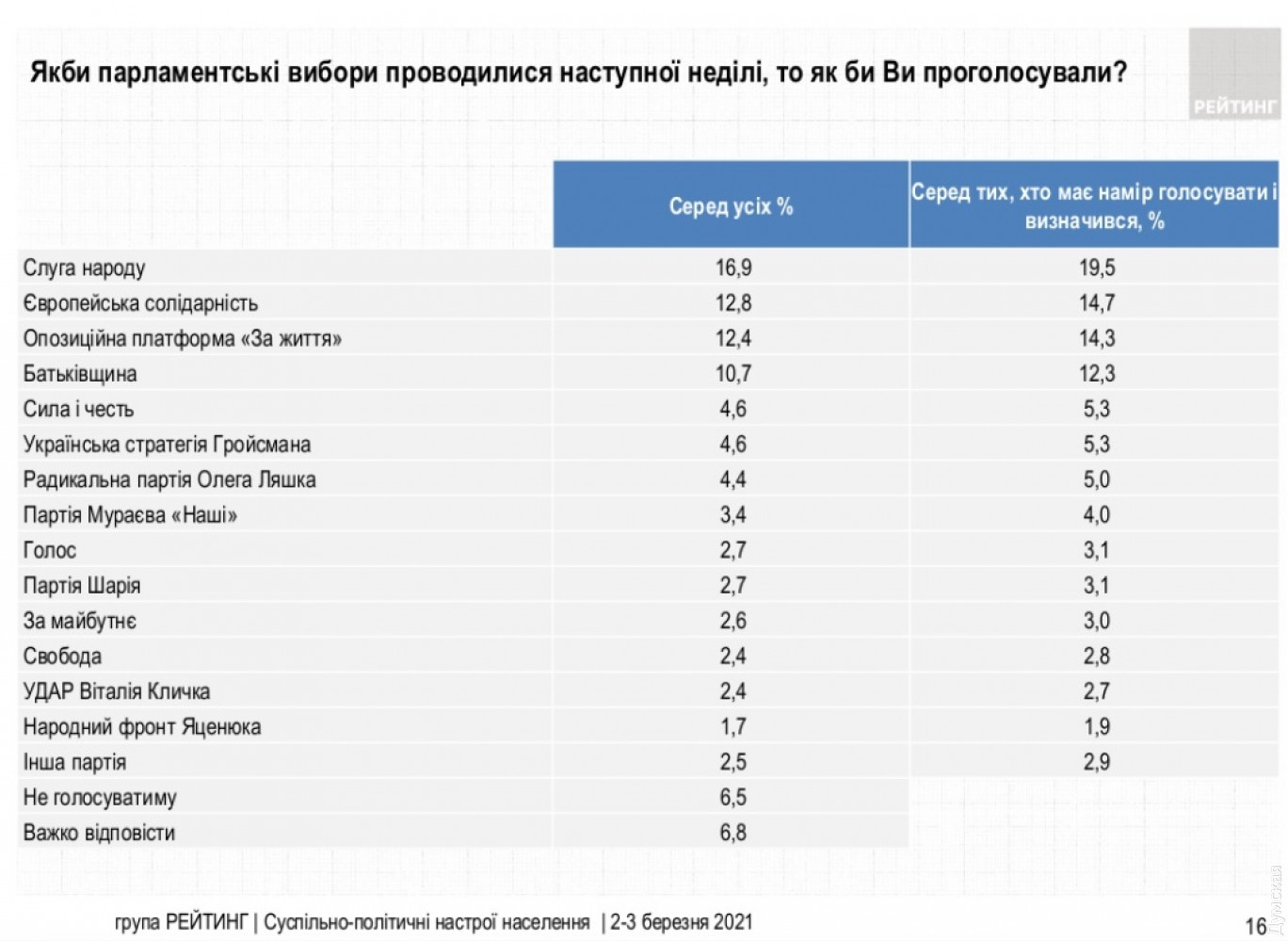 Соцопрос: в Раду проходят семь партий, а второй тур президентских выборов возможен между Порошенко и ЗеленскимЕсли бы парламентские выборы прошли в ближайшее воскресенье, то преодолели бы барьер в 5% и прошли бы в Верховную Раду семь партий. Об этом свидетельствуют результаты соцопроса группы «Рейтинг», проведенного 2-3 марта. Лидирует в рейтинге политическая сила «Слуга народа»: среди тех, кто определился и намерен голосовать, «слуги» набирают 19,5%. «Евросолидарность» во главе с Петром Порошенко готовы поддержать 14,7%. Следующую позицию занимает ОПЗЖ – 14,3% (14,2%), далее идет «Батькивщина» – 12,3% (12,0%). Преодолевает барьер «Сила и Честь» – 5,3% (4,4%), «Украинская стратегия» Владимира Гройсмана – 5,3% (5,1%) и Радикальная партия Олега Ляшко – 5,0%. Президентский рейтинг возглавляет Зеленский — за него готовы отдать голос 22,5% из тех, кто намерен идти на выборы и определился с со своим кандидатом. За Петра Порошенко проголосовали бы 14,6%. Бойко отдадут свои голоса 11,6% опрошенных, Юлии Тимошенко — 11,3%. Опрос проводился методом телефонного интервью со 2-3 марта среди 2500 совершеннолетних украинцев по всей территории Украины, кроме временно оккупированных территорий. Статистическая погрешность – не более 2,0%. СМЕРТЬ РОССИЙСКИМ ОККУПАНТАМ! Заметили ошибку? Выделяйте слова с ошибкой и нажимайте control-enter |