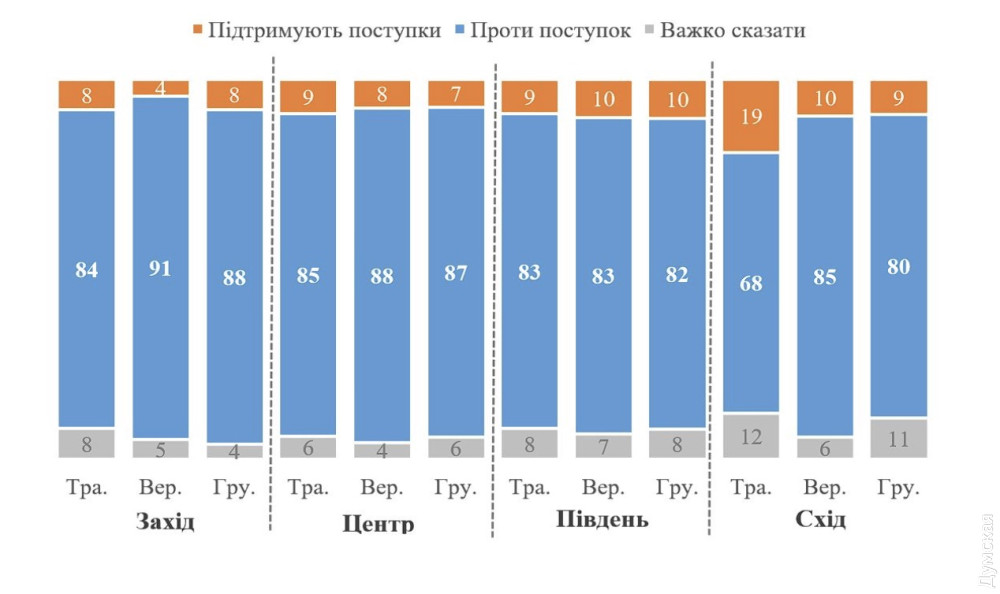 Жителі всіх регіонів України практично одностайні у своїх настроях. На сході не хочуть віддавати жодного метра своєї землі 80% респондентів, на півдні 82%, у центральних областях 87%, а на заході країни 88%.