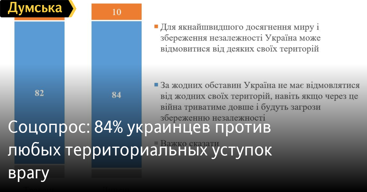 Соцопитування: 84% українців проти будь-яких територіальних поступок ворогові84% українців вважають, що за жодних обставин не можна погоджуватися на будь-які територіальні поступки російським окупантам. Такі результати соцопитування, проведеного 6-20 липня, надав Київський міжнародний інститут соціології. Зазначається, що, порівняно з аналогічним опитуванням, у травні кількість противників «територіального компромісу» з росіянами навіть збільшилася на 2%. Кількість українців, які готові поступитися частиною території держави заради якнайшвидшого досягнення миру, залишається стабільною – 10%. На заході та в центральних регіонах України думка про територіальні поступки майже однакова – проти 87% та 86% респондентів (у травні було 84% та 85%). За якнайшвидший договір з росією по 9% опитаних. На півдні проти поступок 82% (у травні було 83%). За 10% респондентів (у травні було 9%). Найцікавіша динаміка на сході України, де зараз тривають інтенсивні бої. Якщо у травні за якнайшвидший мир виступали 19%, а за продовження боротьби – 68%, то за останні місяці думки людей змінилися – кількість готових поступитися частиною територій скоротилася до 16%, а кількість прихильників продовження боротьби збільшилася до 77%. У рамках соцопитування було методом телефонного інтерв'ю опитано дві тисячі респондентів, які мешкають у всіх регіонах України, крім Криму. СМЕРТЬ РОСІЙСЬКИМ ОКУПАНТАМ! Помітили помилку? Виділяйте слова з помилкою та натискайте control-enter |