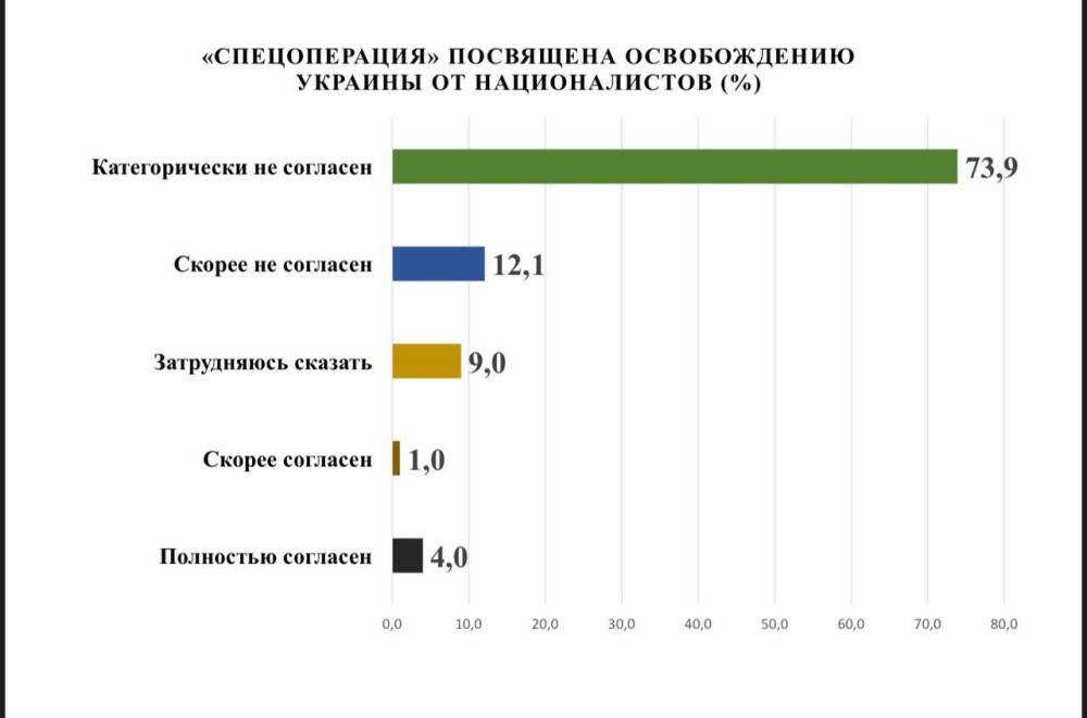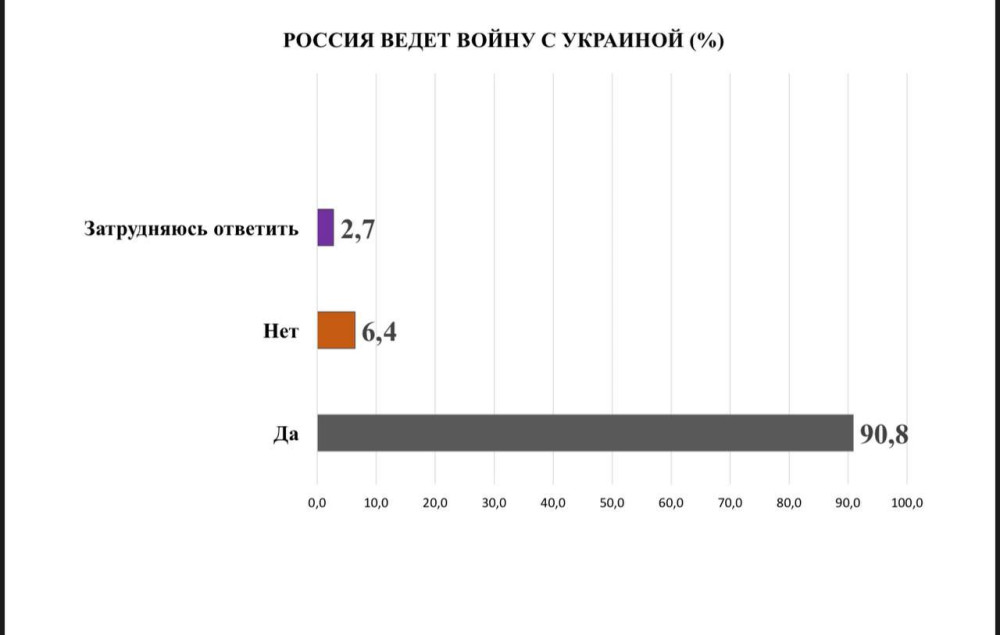 Согласно результатам исследования, 90,8% одесситов считают, что Россия ведет войну с Украиной. Не согласны с этим утверждением всего 6,4% жителей. 81% одесситов не считают войну «спецоперацией», примерно такое же количество горожан не согласно с тезисом российской пропаганды, что ее целью является «освобождение Украины от националистов». С последним согласны только 5% респондентов.