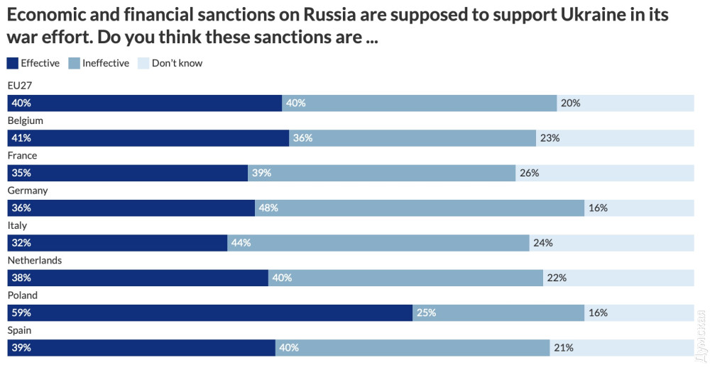 Ефективність санкцій викликає у громадян ЄС сумніви. Думки розділилися рівно порівну — 40% вважають, що санкції ефективні і ще 40% не згодні з цим. Найкраще ставляться до санкцій громадяни Польщі (59% проти 25%), найгірше італійці (32% за і 44% проти).