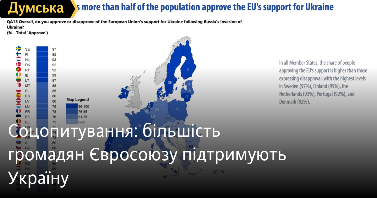 Найвищий рівень підтримки курсу уряду на підтримку України у Фінляндії (96%), Швеції (96%), Нідерландах (93%), Данії (92%), Італії (91%) та Португалії (90%).