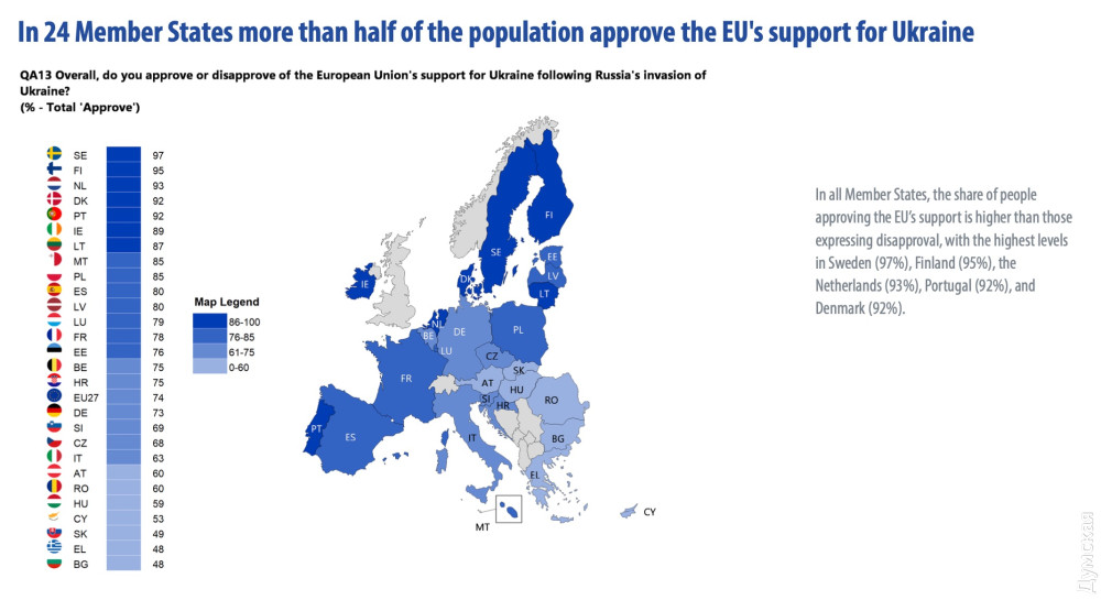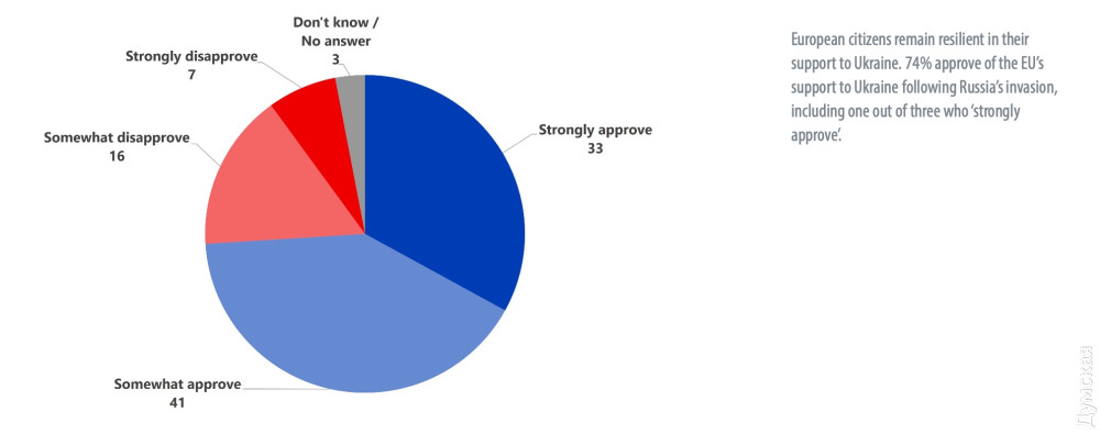 74% громадян Європейського Союзу підтримують Україну в умовах війни проти нацистської Росії. 73% підтримують ті кроки, які роблять їхні уряди для надання допомоги Україні.