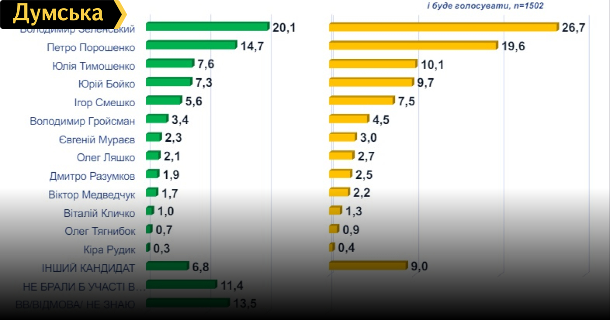 Соцопрос: «Слуга народа» и «Евросолидарность» почти сравнялись в рейтинге партий, а Зеленский минимально обходит ПорошенкоЕсли бы выборы главы государства состоялись в ближайшее воскресенье, то на наибольшую поддержку могли бы рассчитывать нынешний президент Владимир Зеленский и пятый президент Петр Порошенко. Об этом говорится в исследовании компании SOCIS, которая проверяла электоральные предпочтения украинцев по состоянию на апрель. Так, среди тех, кто определился и будет голосовать, 26,7% готовы поддержать Зеленского, 19,6% — Порошенко. На третьем месте — Юлия Тимошенко, за которую проголосовали бы 10,1% опрошенных граждан, за Юрия Бойко — 9,7%. Возглавляют антирейтинг электоральных симпатий пророссийские политики Медведчук и Бойко, набравшие по 27,5%, им уступает Порошенко — 27,2% и Зеленский — 22,7%. Социологи спрогнозировали ситуацию второго тура выборов, из чего следует, что рейтинг Зеленского с 2019 года снизился значительно: нынешнего президента готовы поддержать 56,3% среди тех, кто определился и придет голосовать, Петра Порошенко — 43,7%. Что касается рейтинга партий, то лидирует «Слуга народа» с 22,7% и незначительно уступает «Европейская солидарность» с 20,4% поддержки избирателей. Далее следует ОПЗЖ с 12%, за «Батьківщину» отдадут 10,8%, партия Смешко «Сила и честь» по данным SOCIS, проходит барьер, набрав 6,4% голосов. СМЕРТЬ РОСІЙСЬКИМ ОКУПАНТАМ! Помітили помилку? Виділяйте слова з помилкою та натискайте control-enter