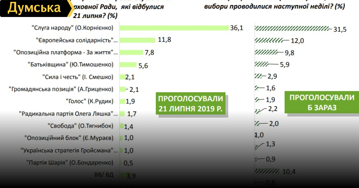 Соцопрос: у «Слуги народа» рейтинг упал, у «ЕС» вырос, а Зеленский по-прежнему популярней остальных политиковСвежие данные электоральных предпочтений украинцев опубликовал Центр социальных и маркетинговых исследований Socis. По данным исследования, если бы парламентские выборы состоялись в следующее воскресенье, 31,5% граждан Украины готовы были проголосовать за партию «Слуга народа». При этом социологи фиксируют снижение рейтинга президентской партии почти на 5 пунктов (против 36,1%). Согласно результатам опроса, партия «Европейская солидарность» повысила рейтинг и получила 12% голосов (о голосовании за «ЕС» 21 июля сообщили 11,8% опрошенных). На третьей строчке рейтинга разместилась «ОПЗЖ» с результатом 9,8%. При этом партия «Голос» вообще бы не попала в парламент с 1,9% поддержки избирателей. По данным социологов, среди украинских политиков Владимир Зеленский по-прежнему лидирует по популярности — за него проголосовали бы 40,4% респондентов. Больше чем на 2 пункта вырос рейтинг Петра Порошенко (с 9,6% в феврале до 11,8% в марте) и снизился рейтинг Юлии Тимошенко (с 7,5% в феврале до 5,1% в марте). Опрос проводился в период с 13 по 23 марта 2020 года методом CAPI с использованием планшетов. Выборка представляет взрослое население Украины, кроме Крыма и временно оккупированных территорий Донецкой и Луганской областей, по таким показателям как пол, возраст, регион проживания и тип населенного пункта. Объем выборки составил 2 тыс. респондентов. СМЕРТЬ РОСІЙСЬКИМ ОКУПАНТАМ! Помітили помилку? Виділяйте слова з помилкою та натискайте control-enter