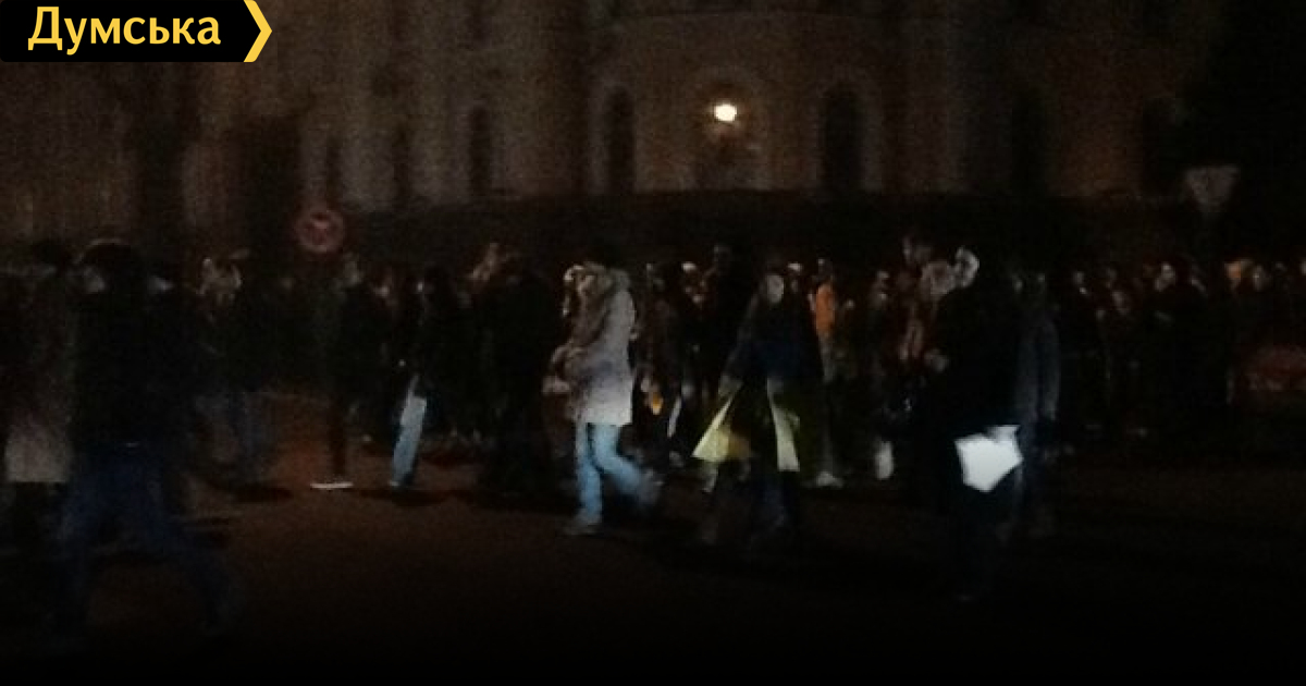 На Пушкинской у здания прокуратуры толпа остановилась и спела гимн Украины. Сейчас колонна приблизилась к мэрии, сюда же подъехали два небольших автобуса с сотрудниками милиции.