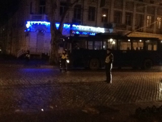 На Пушкинской у здания прокуратуры толпа остановилась и спела гимн Украины. Сейчас колонна приблизилась к мэрии, сюда же подъехали два небольших автобуса с сотрудниками милиции.