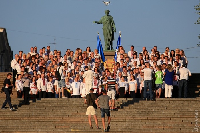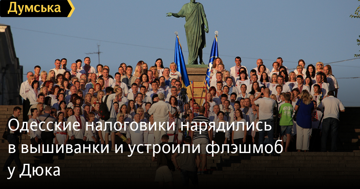 Сегодня рано утром сотрудники Государственной фискальной службы Украины Одесской области провели патриотический флэшмоб на Потемкинской лестнице. Акция посвящена предстоящему Дню Независимости Украины. Фискальщики рано утром прибыли к Дюку в вышиванках и с цветами. Их стройные ряды усилил ансамбль песни и пляски ВМСУ. Численность участников акции достигла 120 человек. Спев гимн Украины на камеру, налоговики разошлись.