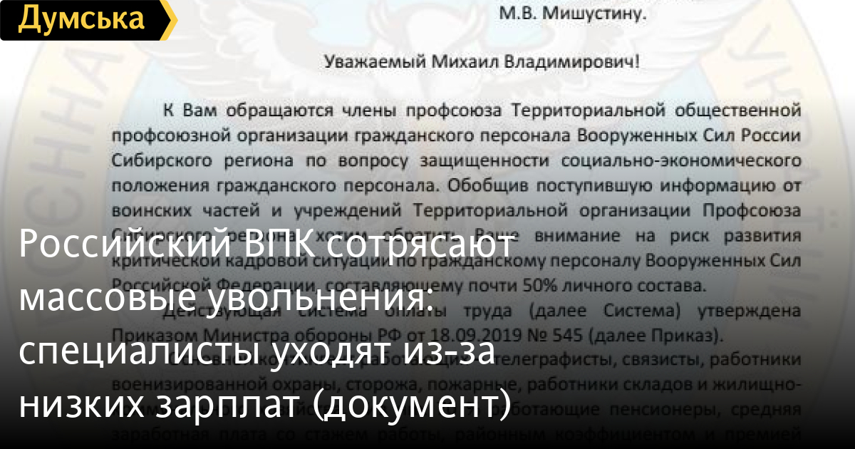 Авторы письма утверждают, что «процесс снижения укомплектованности воинских частей и учреждений гражданским персоналом носит устойчивый характер». Поэтому происходит массовое увольнение квалифицированных сотрудников.