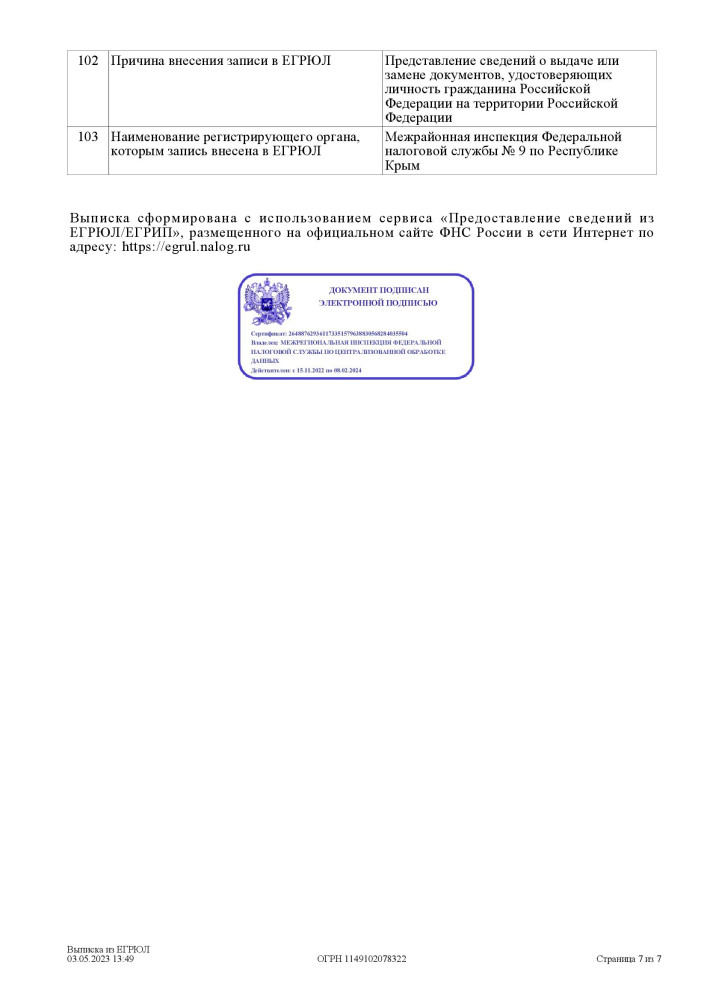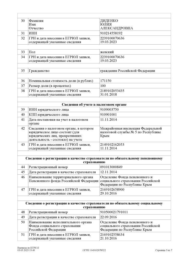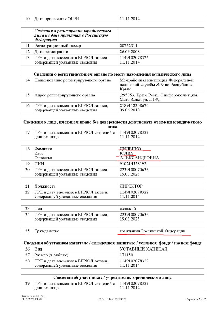 В ноябре 2014 года, уже после начала временной оккупации полуострова, фирму перерегистрировали в российской юрисдикции – с государственным регистрационным номером 1149102078322. Согласно данным реестра юрлиц рф, директором и единственным учредителем компании является все та же Диденко Юлия Александровна, причем отмечается, что она гражданка страны-агрессора.