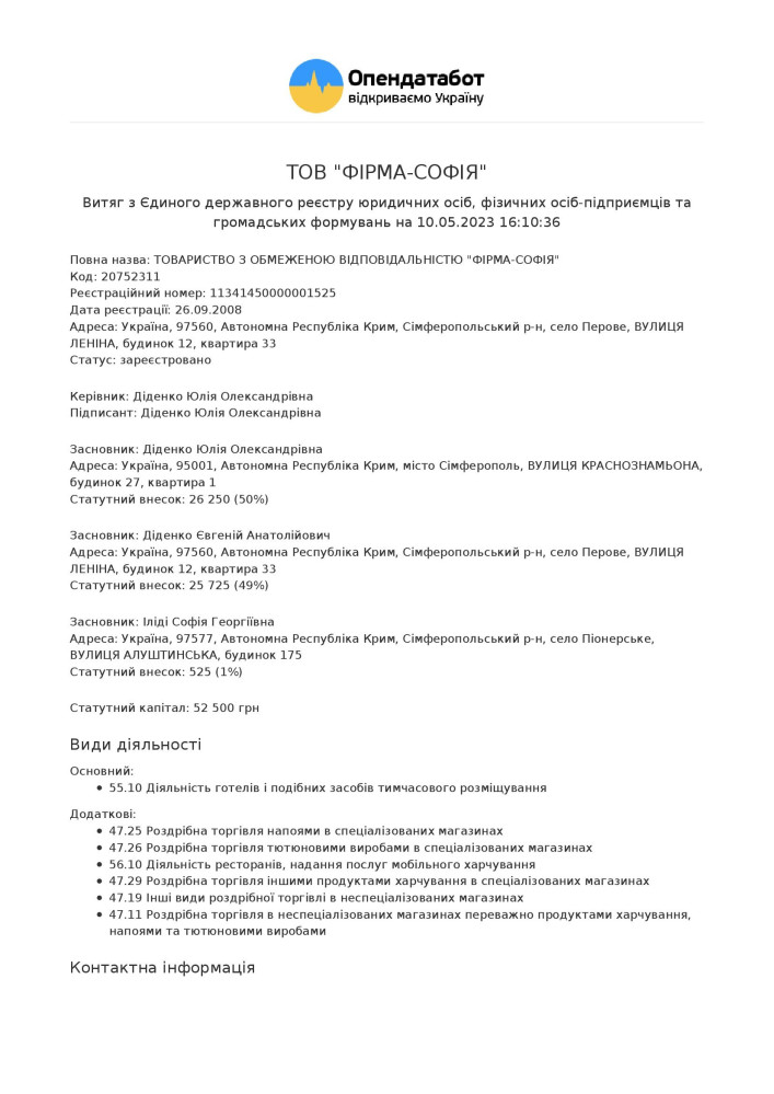 Учредители Диденко Юлия Александровна, Диденко Евгений Анатольевич и Илиди София Георгиевна, при этом Юлия Диденко 50% уставного капитала, то есть контроль. Судя по всему, это небольшой отель в пригороде крымской столицы.