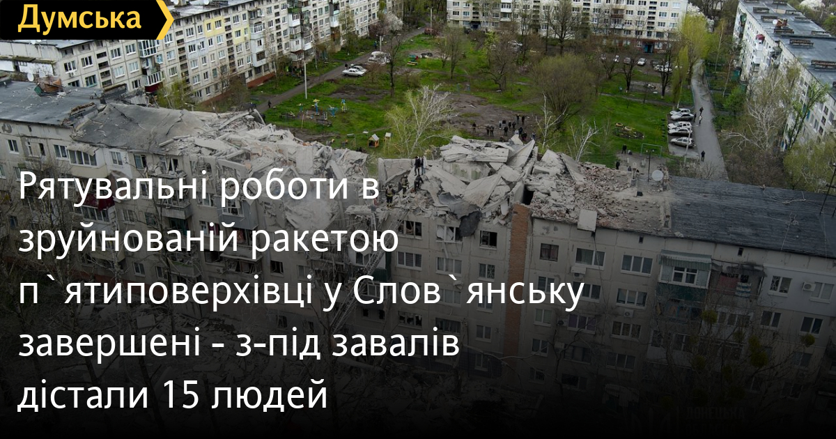 Рятувальники завершили розбір завалів зруйнованої ворожою ракетою С-300 п'ятиповерхівки в місті Слов'янськ Донецької області.